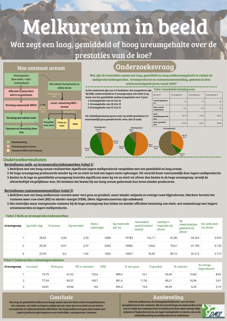 Onlangs heeft Marina bij ons haar afstudeeronderzoek naar ureum afgerond! In het onderzoek zijn drie groepen vergeleken met een laag, gemiddeld en hoog melkureum voor onder andere melkproductie, levensproductie en rantsoen. De resultaten zie je in de factsheet!